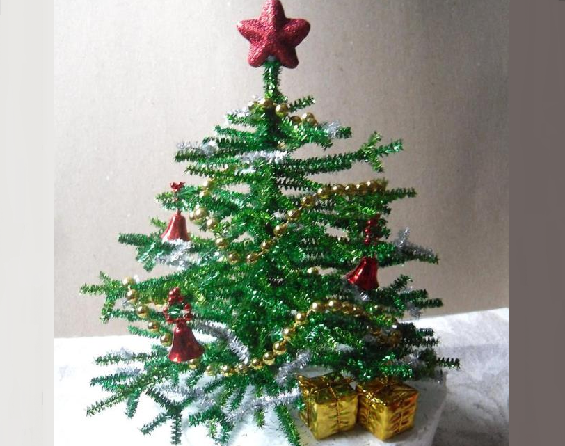 Самый простой способ такой поделки состоит в следующем: необходимо взять мягкую проволоку и сгибать ее в спираль, при этом, каждый следующий виток обязательно должен быть меньше предыдущего. В конце нужно оставить кончик, это будет макушка, на которую можно прикрепить звезду. А дальше следует украшать лесную красавицу. Выбор материала для этого зависит от фантазии и креатива: гирлянда, мишура, органза, елочные игрушки, нитки, бусины, снежинки и т. д.