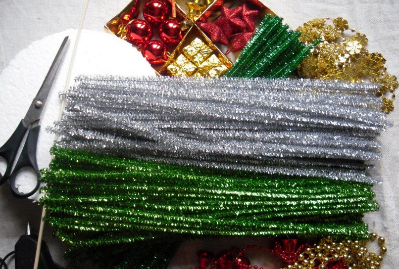 Материалы и инструменты для новогодней ели своими руками из мишуры