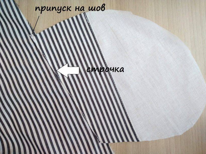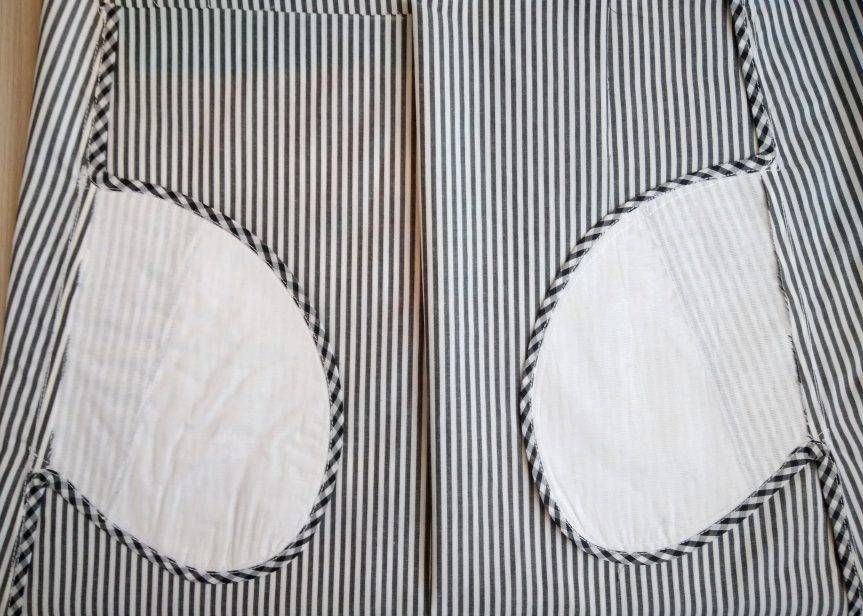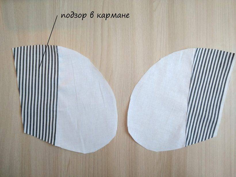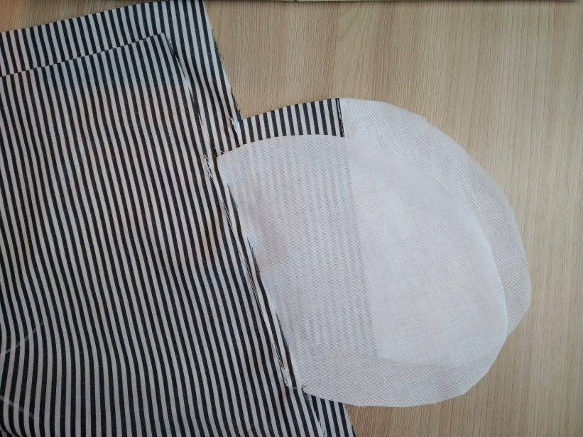 Если для его выкройки вы использовали ткань отличной фактуры, то для маскировки видимой части нашейте туда полоски основной материи шириной пять сантиметров. Сделать это нужно только на двух деталях «мешочка», которые будут пришиты к заднему полотнищу готового изделия.