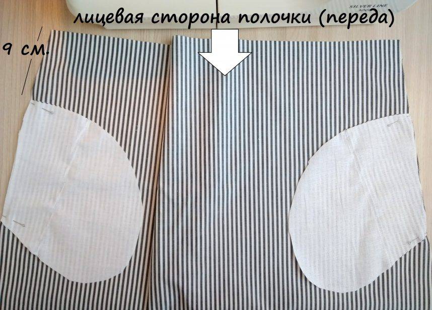 - На полочку передней части вещи наложите лицевой стороной детали «мешочка», не имеющие подзора, отмерив по шву сбоку 9 см от талии.