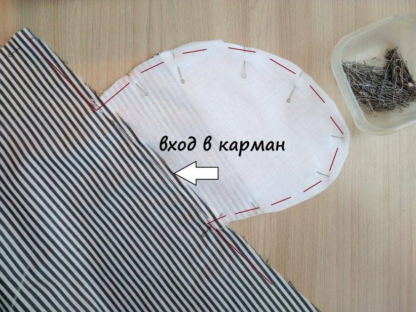 - Сколите булавками, не пропуская детали левого и правого «мешочков».