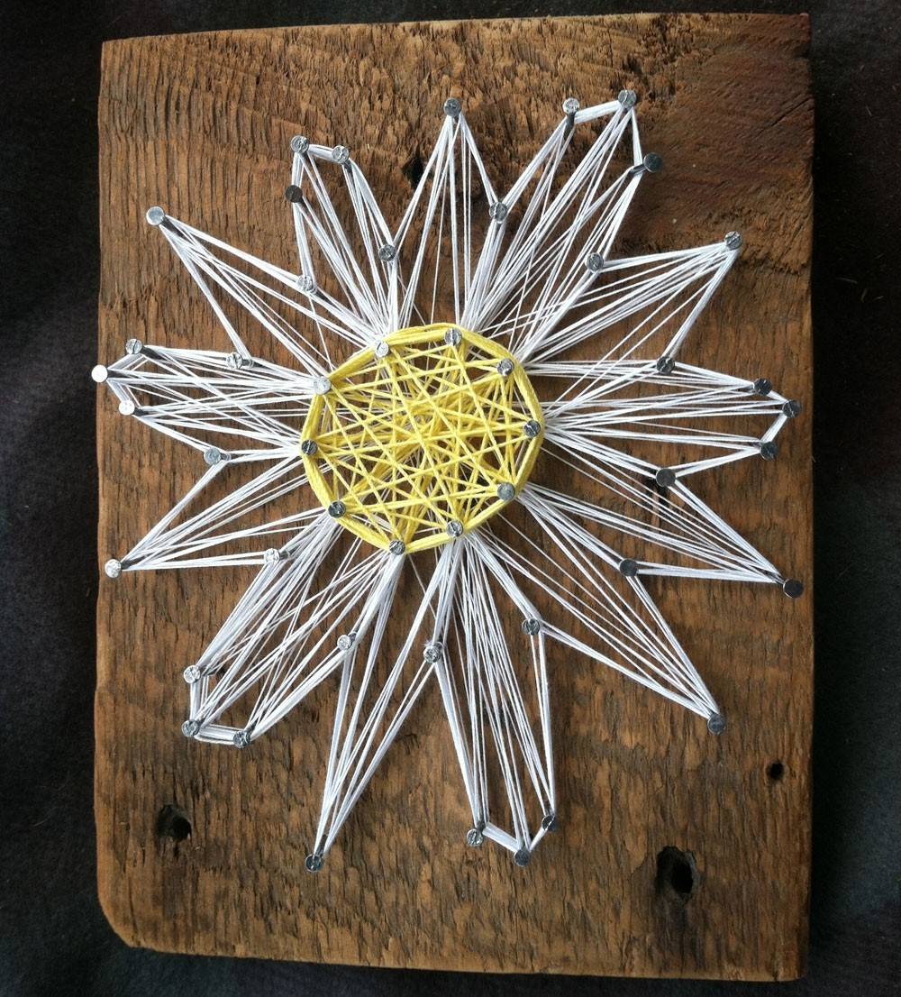 Что же можно сделать, вооружившись обычными гвоздями, разноцветными нитками и использовав в качестве основы спил дерева или обыкновенную гладкую дощечку?