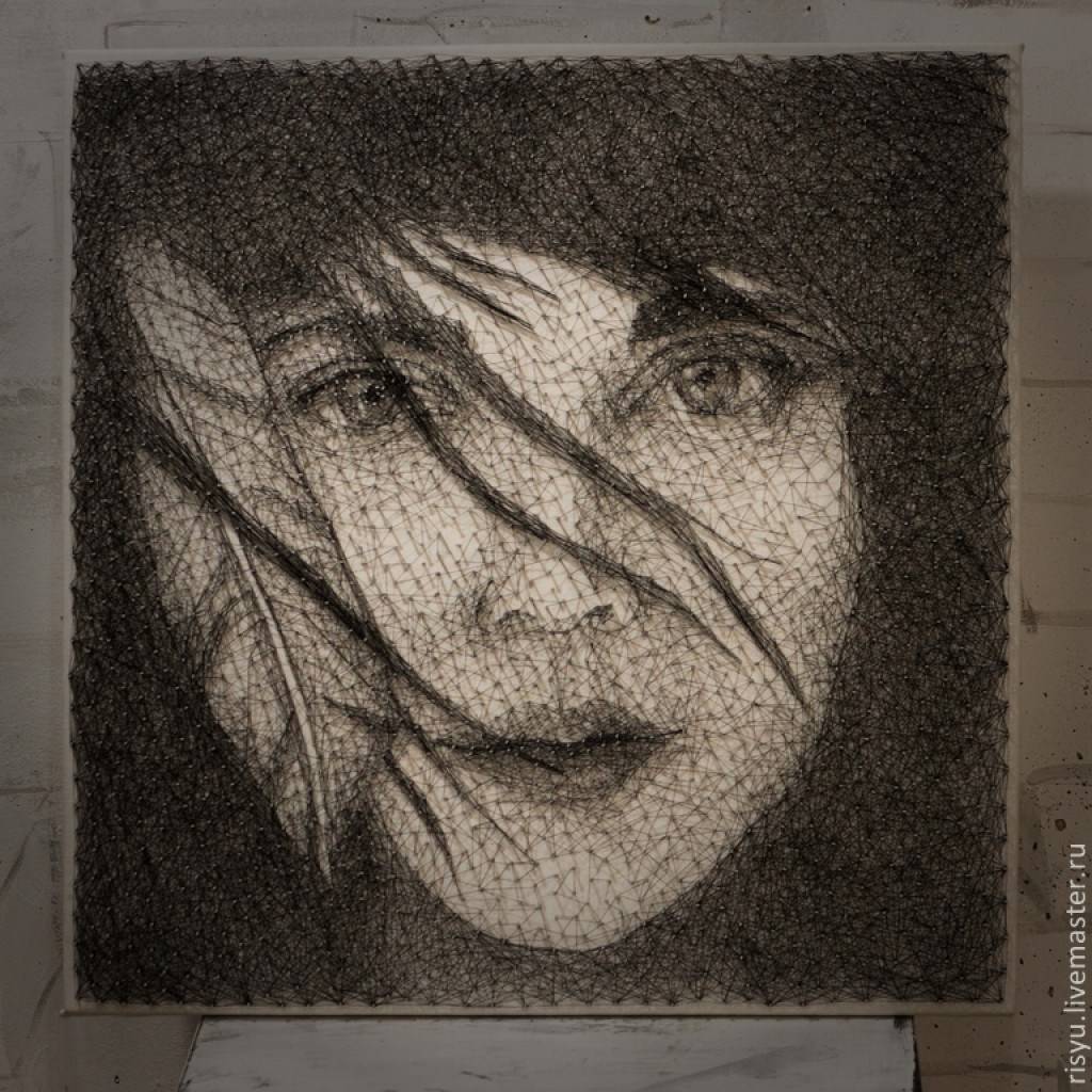 Если вы уже достаточно освоились в технике изонить и уверены в своих силах, то самое время приступать к созданию эффектных портретов из гвоздей и ниток. В качестве основы возьмите портрет любимого человека, известной личности, домашнего питомца.