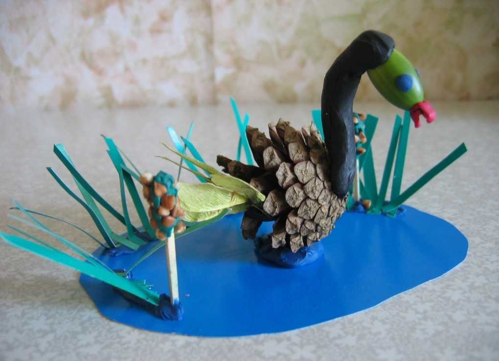 Из шишки можно сделать прекрасного лебедя. Для этого понадобится белый, красный и черный пластилин. Сосновая шишка будет телом птицы и размещается на картоне, покрытом слоем синего пластилина, имитирующего воду. Далее нужно сделать белую шею с красными щеками и клювом. Из черного пластилина изготавливаются глаза. Дополнительно формируются крылья. Если их вылепить из пластилина, то можно создать композицию с взлетающим лебедем.