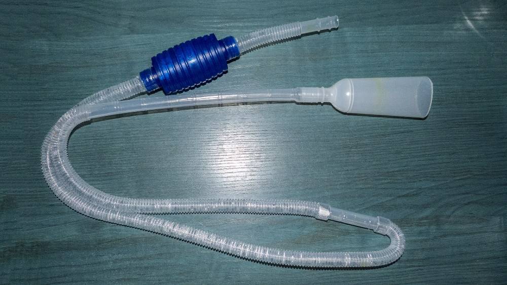 Сифон можно купить готовый, но чаще его делают своими руками. Наиболее простой вариант – трубка, прикрытая на конце крупной сеткой. Очистка осуществляется по принципу двух сообщающихся сосудов. Но можно и усложнить конструкцию. Для этого подойдет ручная помпа.