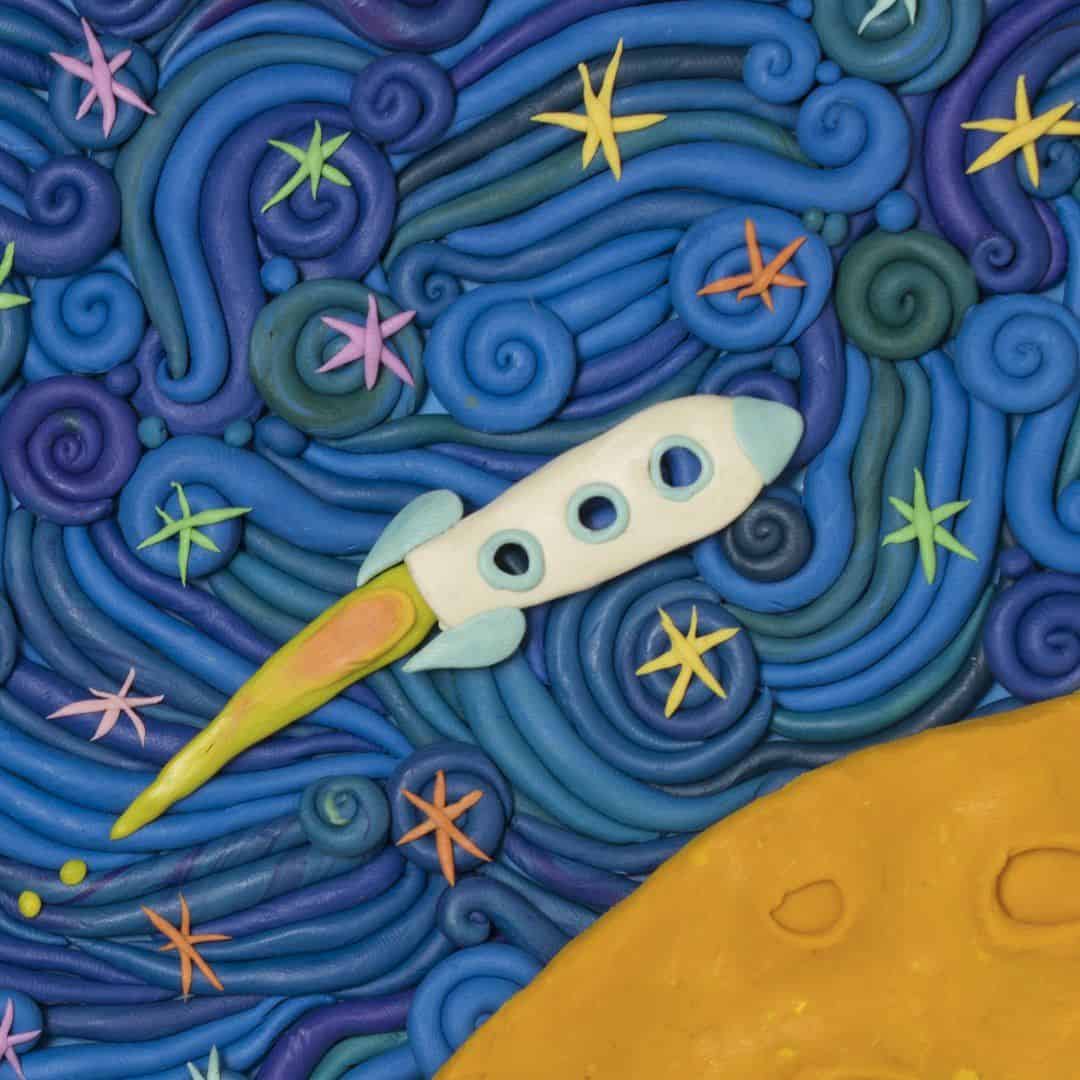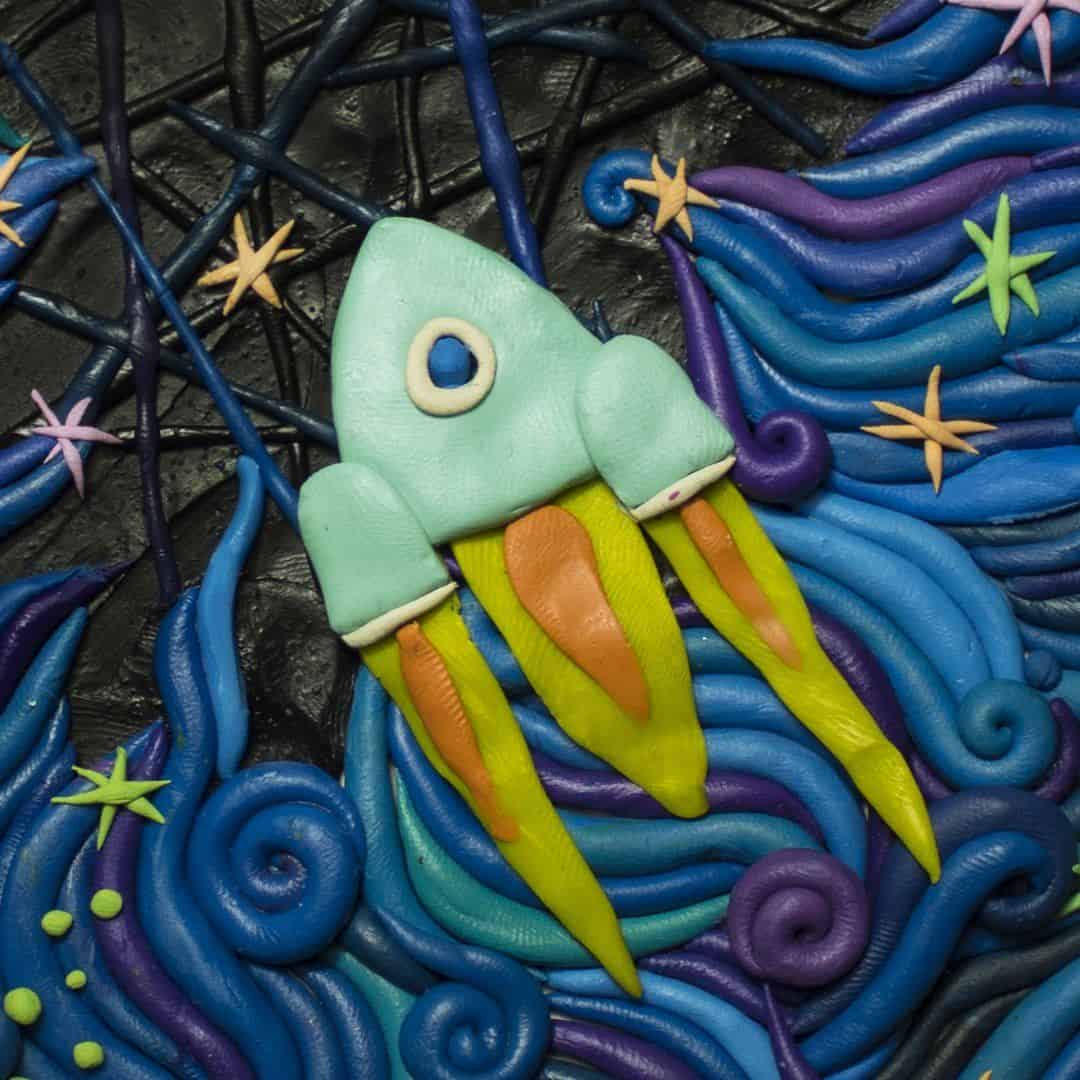 - Теперь сделаем космическую ракету. Для этого лепим объемную игрушку. В работе можно совмещать сразу несколько техник и мазки, и жгутики. Ее прикрепляем к картине.