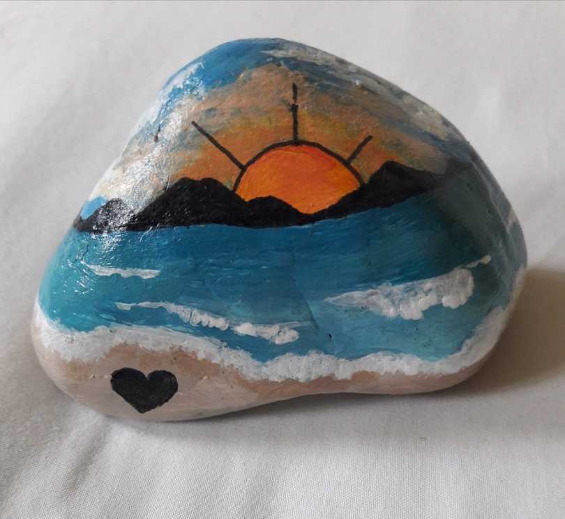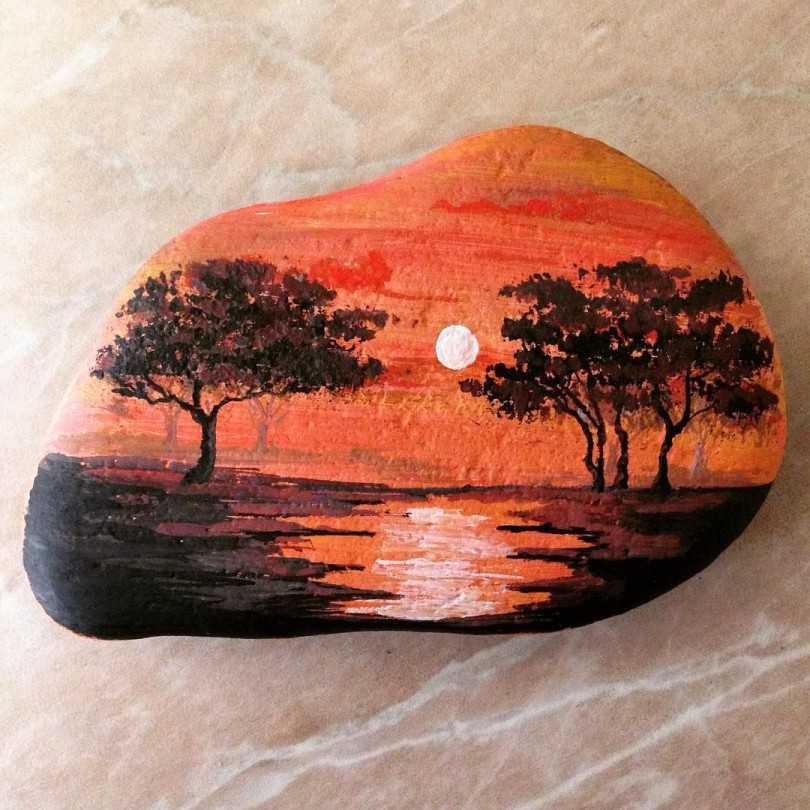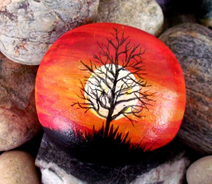 Вам понадобится: камень подходящей формы, простой карандаш, акриловые краски чёрного, белого, красного и оранжевого цвета, кисточка, лак.
