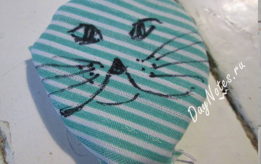 Выкроите лапы и хвост, сшейте их по контуру, затем сделайте тонкими ножницами аккуратные отверстия, выверните и набейте детали. Набейте тельце котика, пришейте глазки, вышейте нитками носик и ротик.