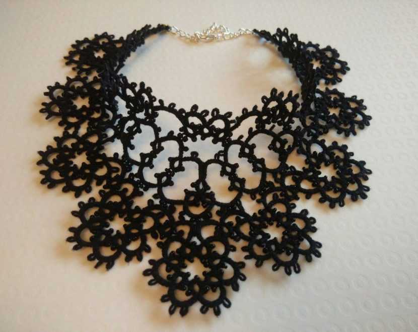 Длина изделия зависит от того, сколько планируется арок и трилистников. В данной работе их число — 12. К кромочным деталям колье присоединить металлические кольца и застежки. Мастер-класс по изготовлению украшения колье из ниток и бисера фриволите закончен.