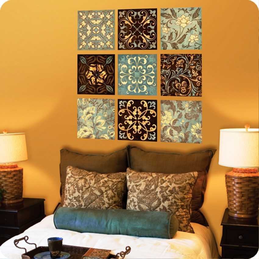 Спальню можно украсить текстильными панно в технике пэчворк или текстильной аппликации, вышивкой, закрепленной на пяльцах, макраме, изображениями в технике нитяной графики.