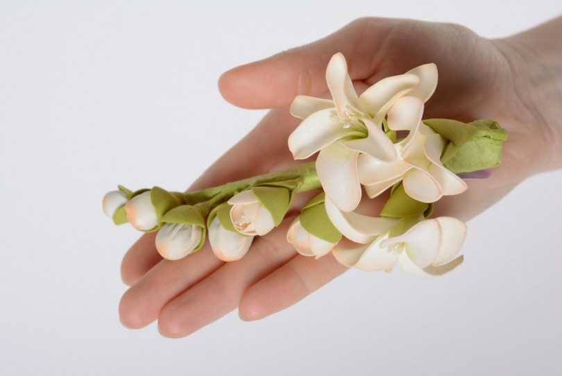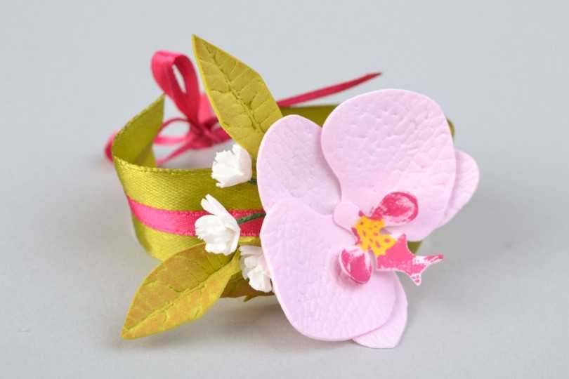 Цветы из этого материала украшают резинки для волос, ободки и заколки.