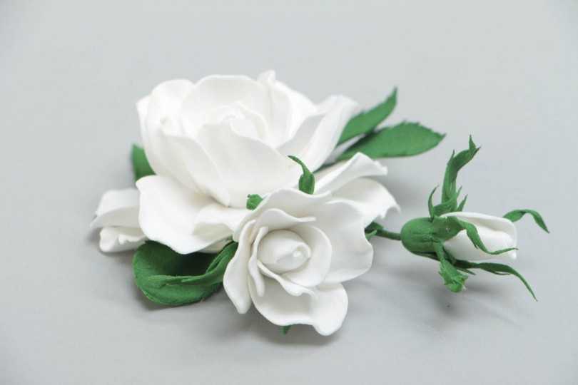 Большие розы из зефирного фоамирана выглядят крайне реалистично, отличаясь стойкостью и длительным сроком эксплуатации. Их можно делать как одноцветными, так и двухцветными или даже разноцветными. Возможен вариант создания стандартной розы, пионовидной или же букета из мелких бутончиков.