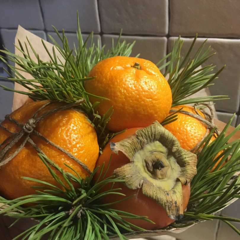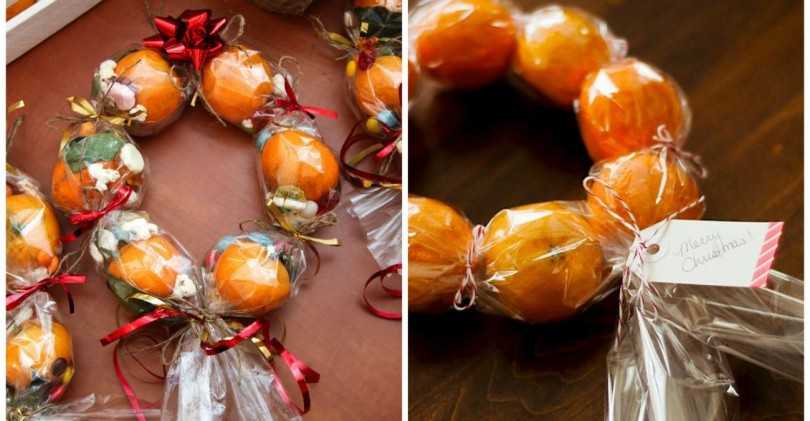 - Обвяжите мандарины шерстяными нитками крест накрест, как показано на изображении.
