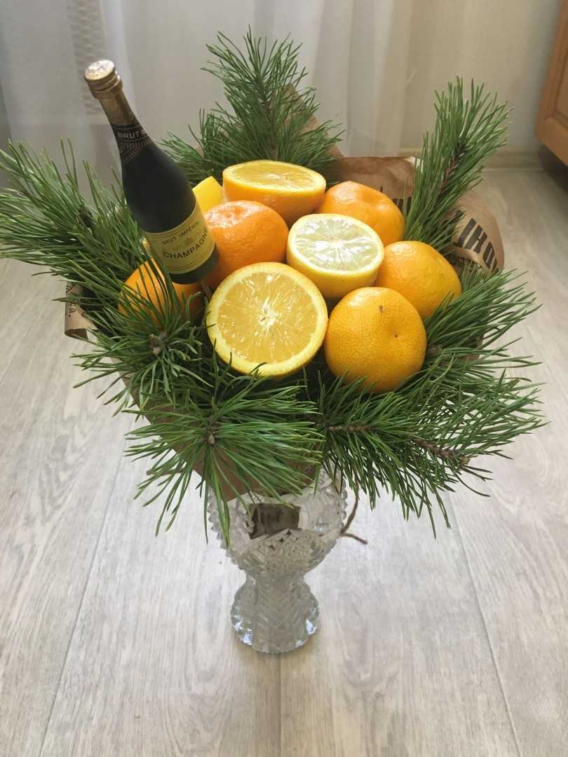 Вам понадобится: кашпо, флористическая губка, крепкая палка, шерстяные нити, проволока, ножницы, канцелярский нож, мандарины, хвойные ветки, зелёные листочки, сахар.