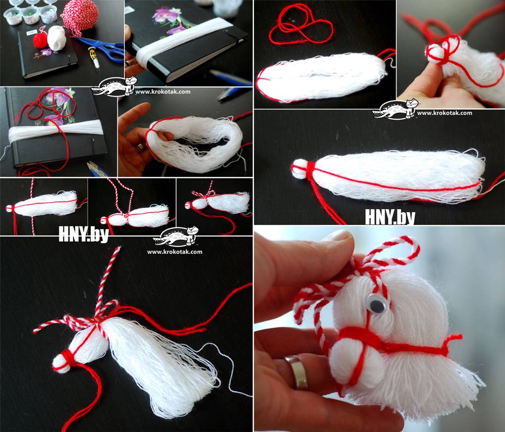Если задание сделать игрушку на елку, можно воспользоваться этим мастер классом, и смастерить лошадку из ниток своими руками. Вам понадобятся нитки для вязания 3-х цветов, глазки или пуговицы, клей. Пошаговый МК смотри ниже.