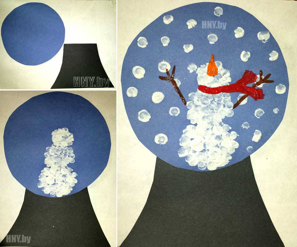 В качестве новогодней поделки в школу в 1 класс можно смастерить снежный шар из бумаги. По сути это обычная аппликация, но в необычном исполнении. Вам понадобится цветная бумага, краски. Рисовать снеговика и снежинки можно пальцами, ватной палочкой или ластиком на карандаше.