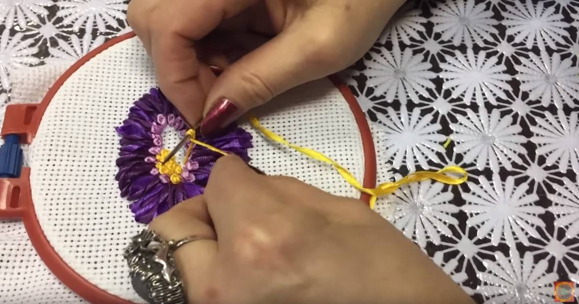 Сначала формируем серединку розы, как для розы «Маркиза». Не забываем закрепить её основание несколькими стежками ниткой в тон ленты.
