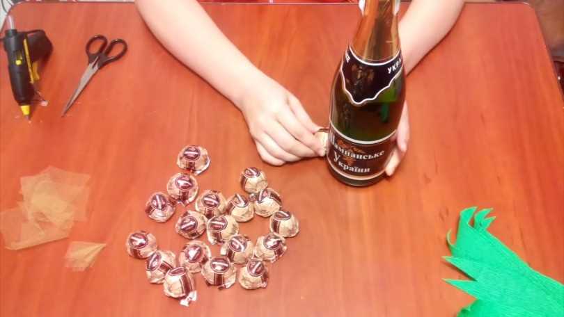 Если вы возьмете бутылку шампанского, то не придется делать обертку. Начнем с приклеивания конфеток Рафаэлло с нижней частицы по кругу. Второй рядок приклеиваем в шахматной расстановке. Проследим за тем, чтобы бутылку не было заметно. Если плохо вышло, лучше обверните шампанское белым фатином. Наклеим конфеты до тех пор, пока не приблизитесь к горлу бутылки. С этого момента надо будет заняться созданием листьев.