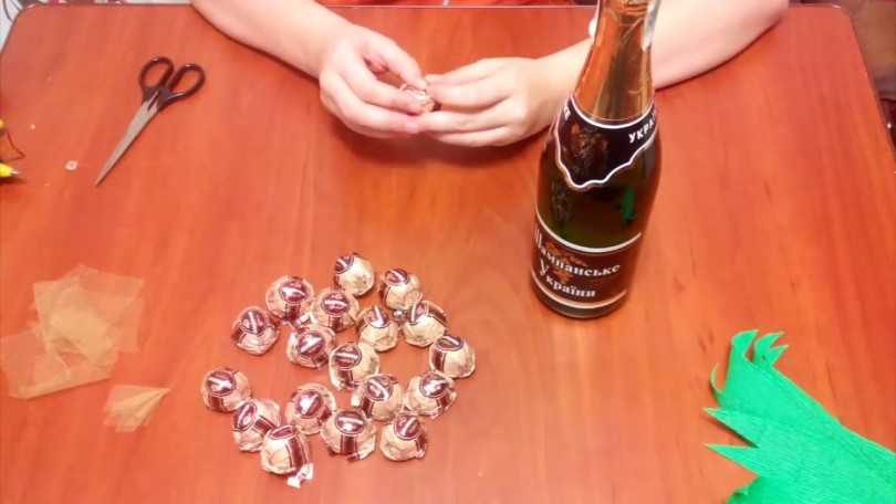 Охладить конфеты полукруглой формы. Хвосты фантиков приклеиваются к плоскому основанию конфеты. Конфеты к бутылке начинают приклеивать от основания листьев, закрывая тем самым их стыки. Конфеты располагаются плотно в шахматном порядке. Дойдя до дна бутылки, работу заканчивают.
