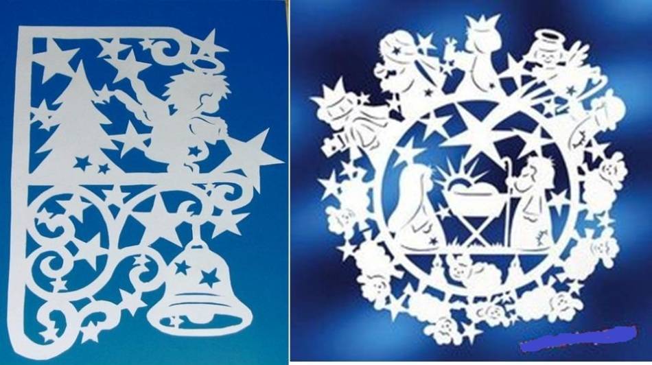 Красиво смотрится детская композиция из бумажных поделок: в корзинку помещена толстая губка на ней еловые веточки, мох. В центре ясли с младенцем и матерью, овцы . осел и другие животные. В губку воткнуты деревянные шпажки, на которых прикреплены вырезанные из бумаги ангелочки, звездочка.