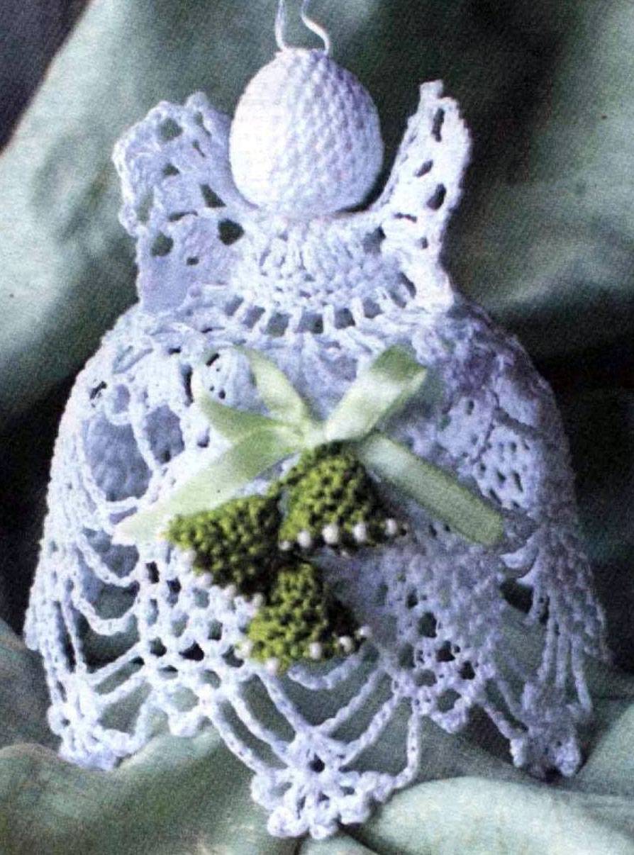 Вязание ангелов крючком Ангелочек с колокольчиками (модель 1). Высота: 12 см.Материалы: пряжа «Ирис» (100% х/б), 15 г белой; немного зелёной; белый мелкий бисер; узкая зелёная атласная ленточка; подходящая форма; немного синтепона; крючок №0,9. Ангел с цветком (модель 2). Высота: 23 см. Материалы: пряжа “Ирис” (100% х/б; 87 м/10 г), 30 г белой; немного капроновой коричневой; 1 бусинка; цветные атласные ленточки; крючок № 0,9.