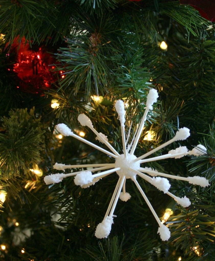 По диагонали прикрепите еще две палочки, чтобы получилась восьмиконечная звезда. Далее формируем нашу снежинку из половинок палочек и из их наконечников. Это может быть и аппликация, и декор для дома.