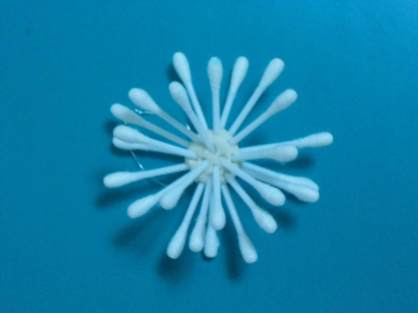 Для начала ватные палочки разрезаются на две равные части. Потом следует их втыкать в маленький шарик из пенопласта, оставляя небольшие промежутки.