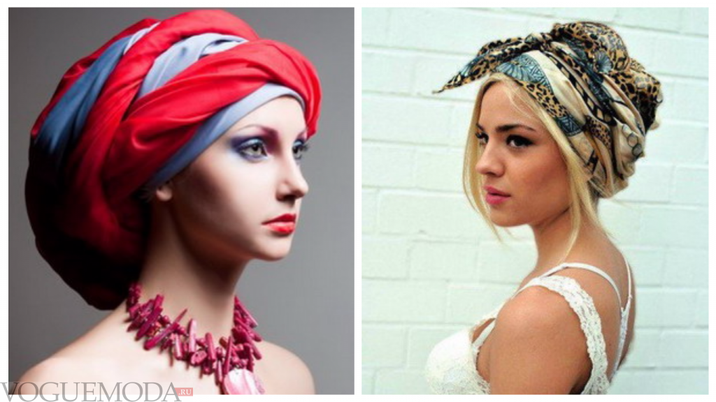 Чтобы палантин превратить в модный тюрбан, стоит сложить его пополам, чтобы один край получился длиннее. Затем ткань накидывается на голову в диагональном направлении, края перекрещиваются на затылке, выводятся ко лбу и укладываются у шеи.
