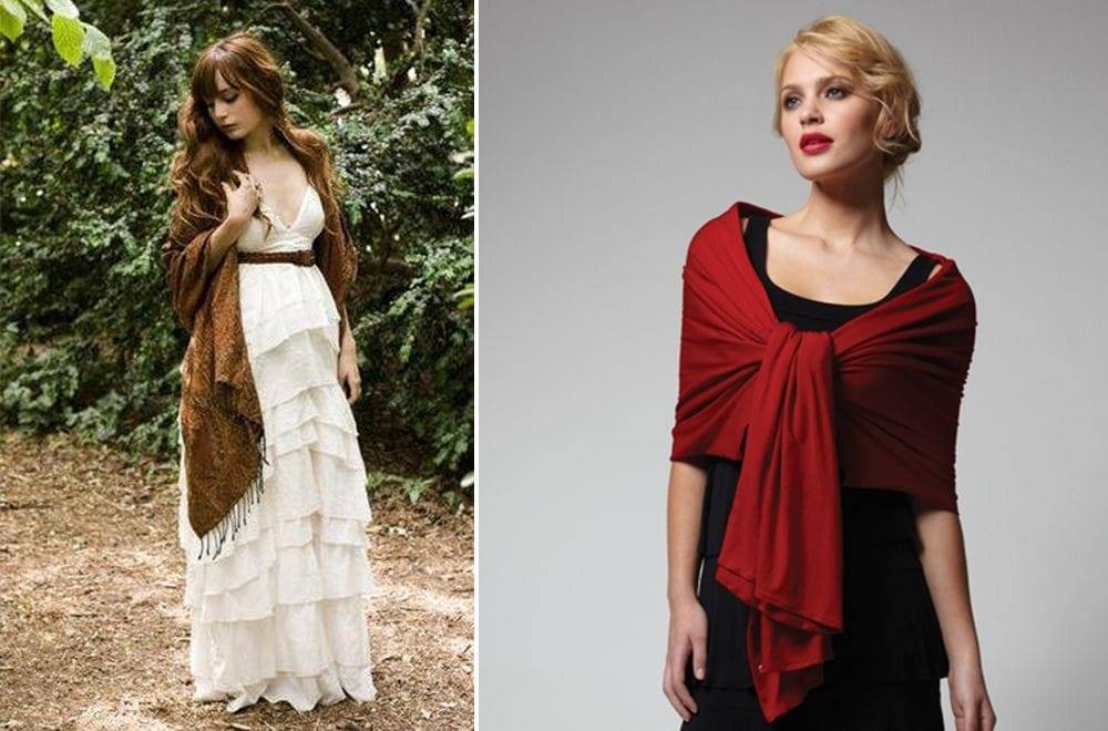 Ткани желательны легкие и мягко спадающие красивыми складками, особенно летом. Подойдет шелк, муар, шифон, гипюр, кружево. Зимой наденьте бархатный палантин. Для особо торжественных случаев можно приобрести изделие из натурального меха.