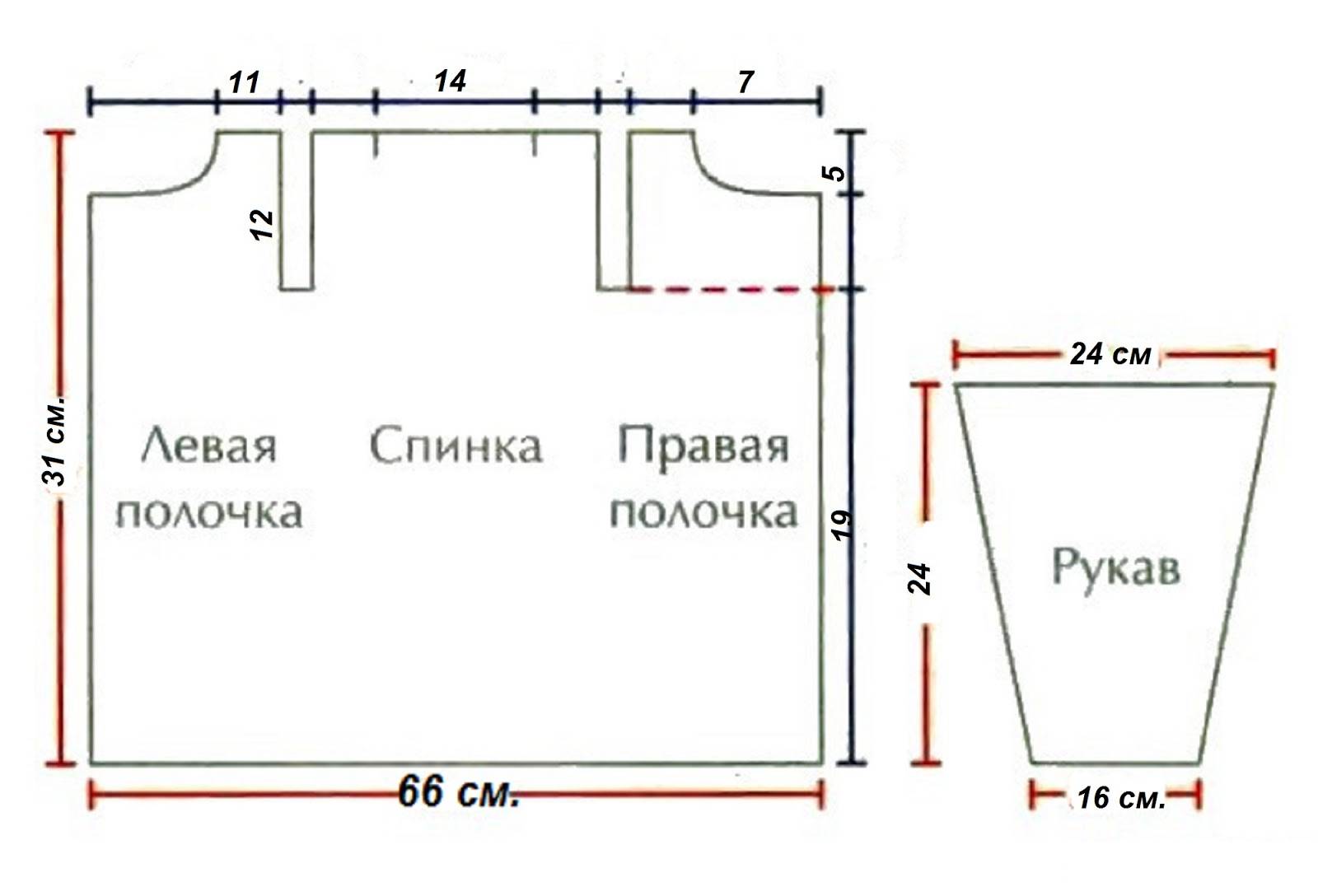 При сборке по верхней планке нужно сшить по 7 см в ее начале и конце (низ рукавов) и по 7 см в плечах. Ширина горловины при этом должна составлять 32 см.