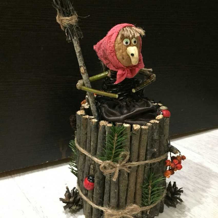 Вот, теперь другое дело! Сажаем нашу Бабу Ягу в ступу. Для полного сказочного комплекта не хватает метлы. Она делается из тонких веточек.