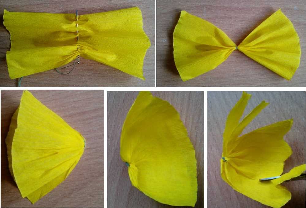 Полученные прямоугольники посередине прошиваем иголкой с ниткой, стягиваем, делаем пару оборотов ниткой. Получается что-то напоминающее бантик. Его сворачиваем пополам, пальцами распрямляем бумагу, стараясь оставить как можно меньше складок — формируем крылья.
