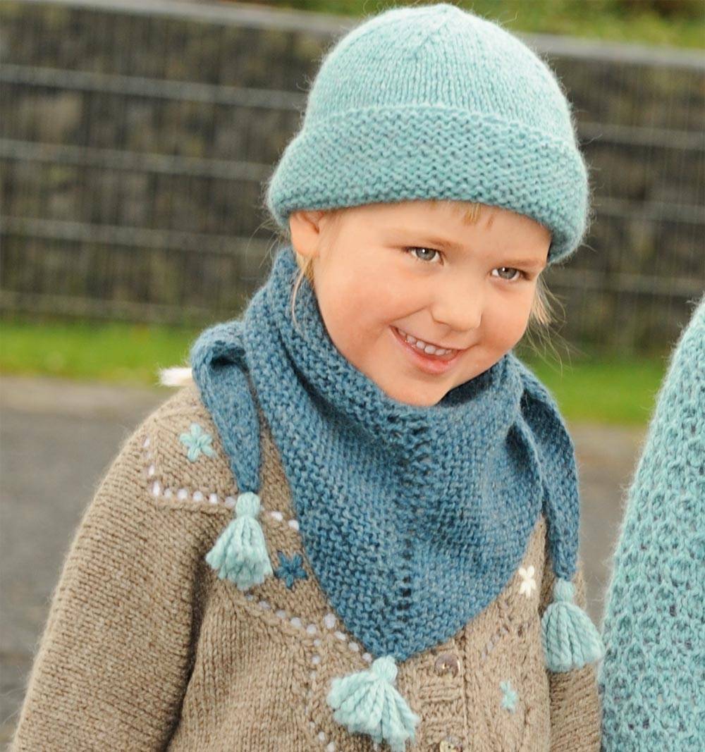 Для работы вам потребуется: Пряжа (100% шерсти ламы; 75 м/50 г) для шапочки – 100 г голубой, для косынки – 100 г цвета морской волны и остатки голубой; для шапочки – чулочные спицы №5; для косынки – круговые спицы №5.