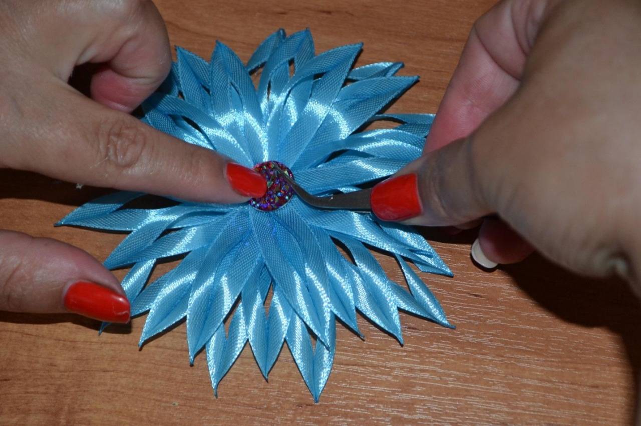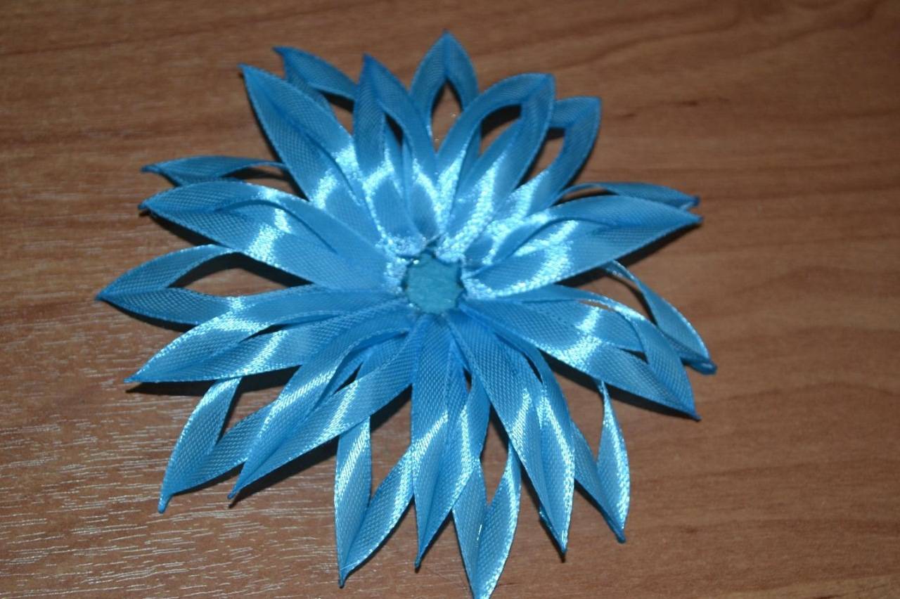 Чтобы своими руками сделать красивый бантик из атласных лент в виде хризантемы, придерживайтесь пошаговой инструкции: