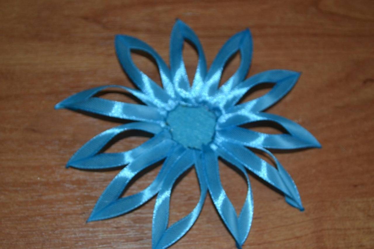 - готовые лепестки из органзы приклеиваются по кругу к основе из фетра по типу бантика канзаши, при этом следует сохранять симметрию расположения лепестков — друг напротив друга;
