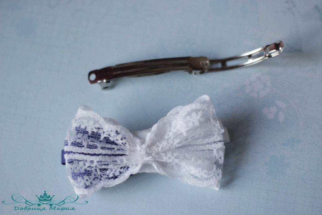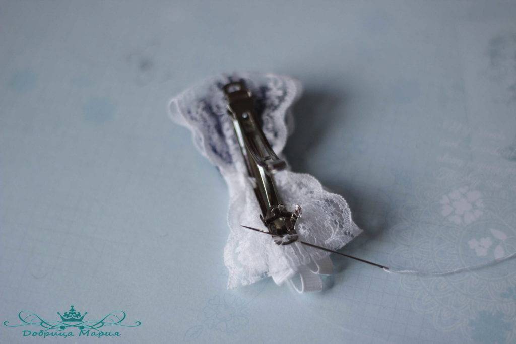 - с изнаночной стороны пришивается любое крепление, позволяющее бантику держаться на волосах, – резинка, невидимка, зажим.