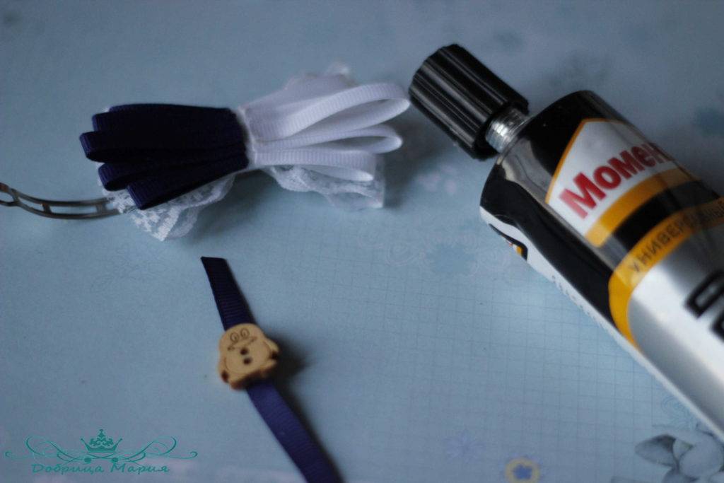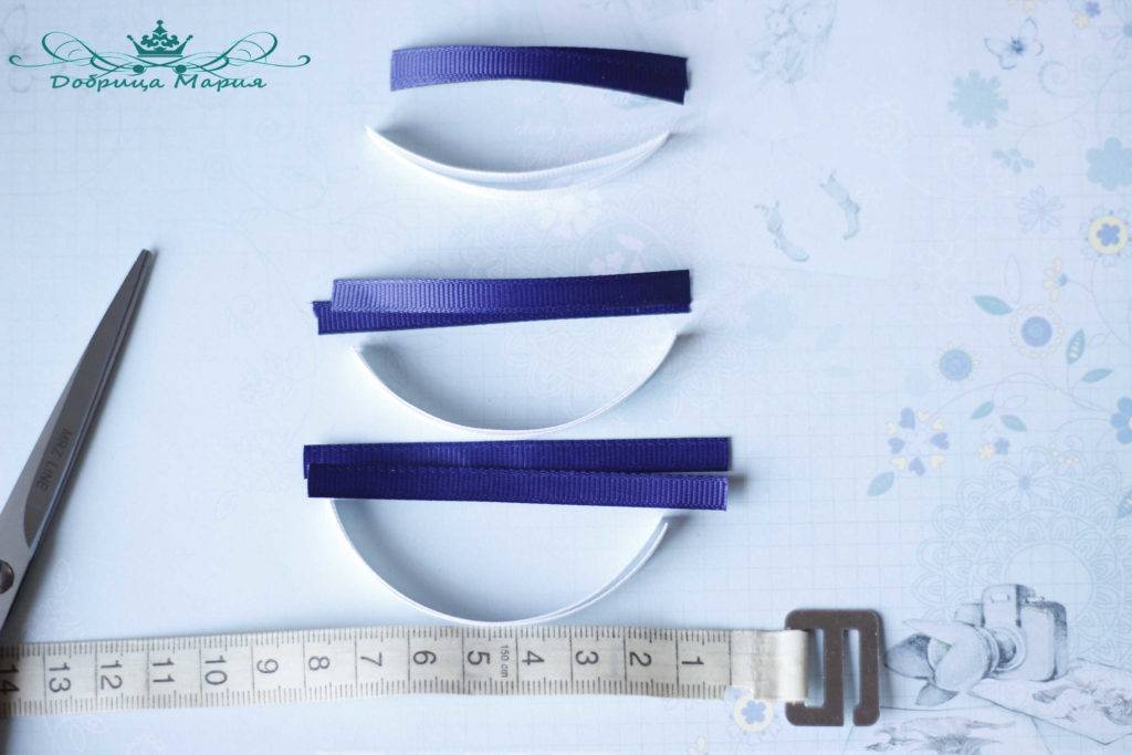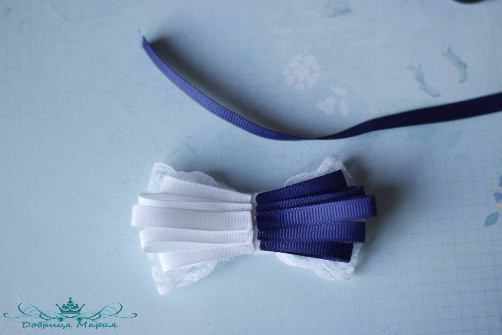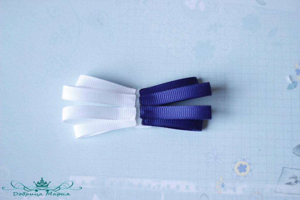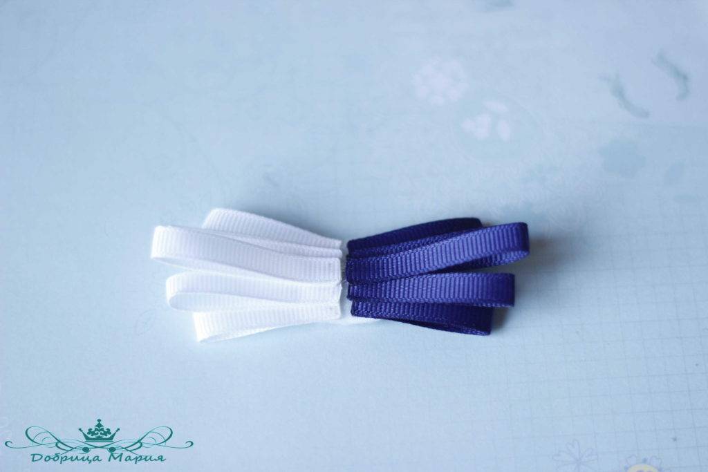 Следующий бантик у нас будет состоять из узкой репсовой ленты 0, 5 см шириной белым и синим цветом.