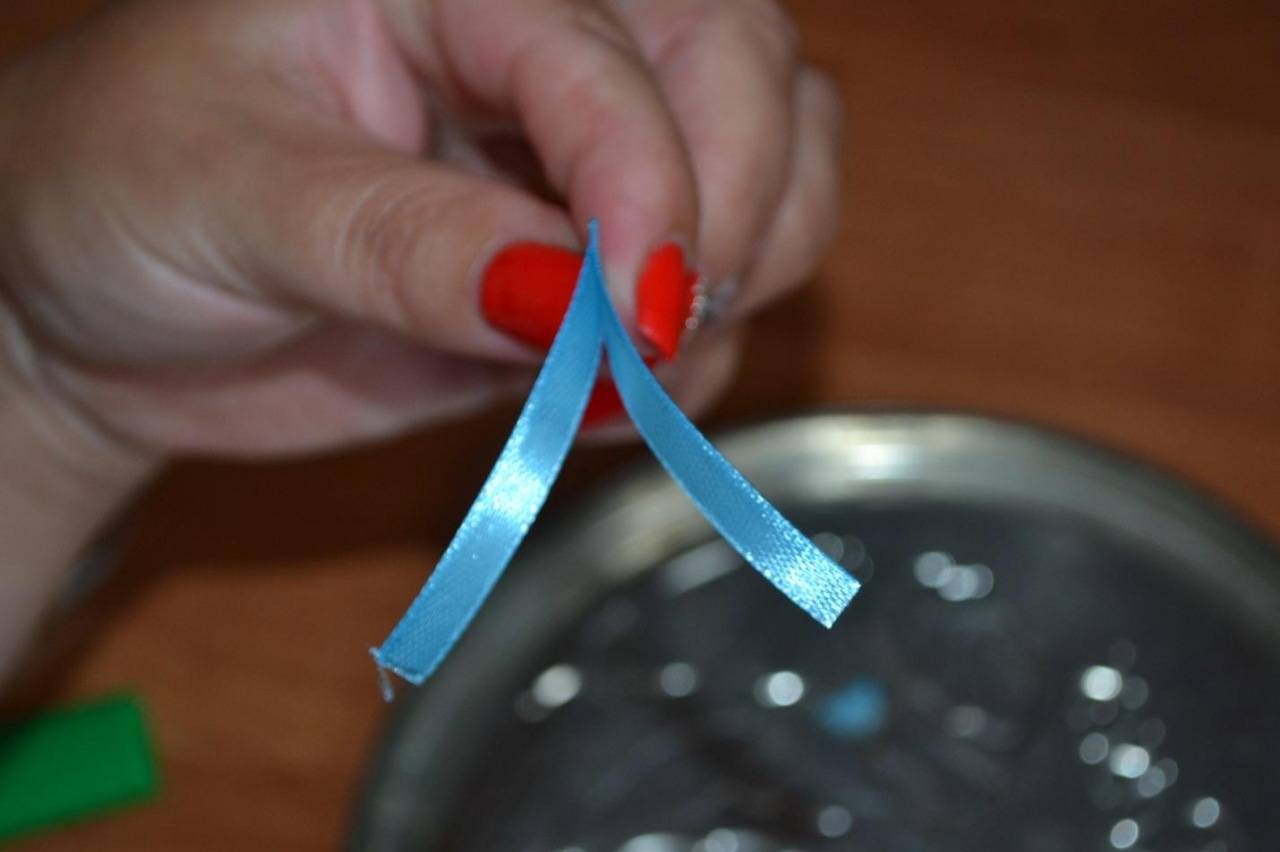 Далее берём отрезок, складываем его вдвое, накладывая один край ленты на другой. Сшиваем или склеиваем края. Повторяем то же самое с оставшимися ленточками.