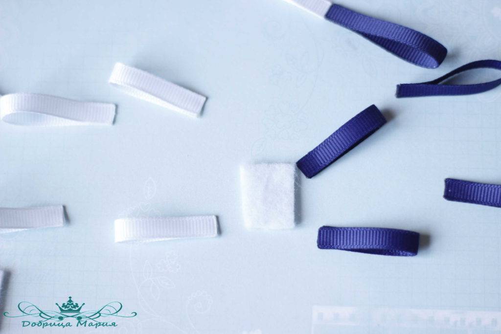 На кусочек фетра приклеиваем наши отрезки ленты самые маленькие 6 см, с одной стороны синим цветом с другой белым, стараемся располагать ровно.