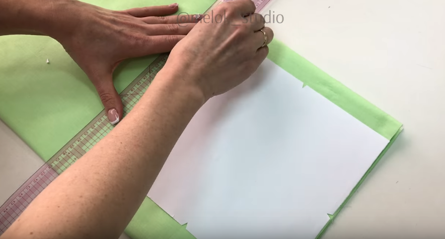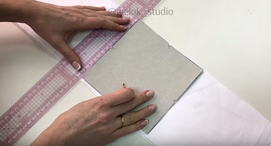 На наружной стороне ткани расчертите прямоугольники с равными сторонами.