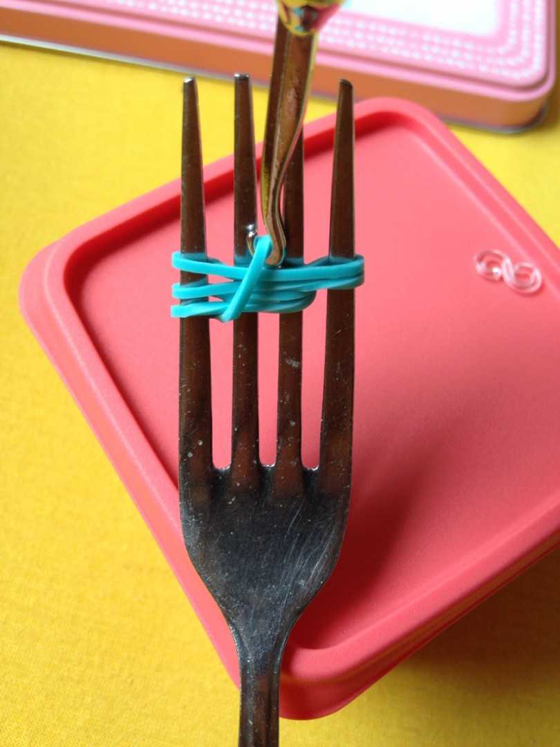 - На одну из вилок надеваем резиновое колечко таким образом, чтобы одна часть вилки была над цветными узорами, а вторая сверху.