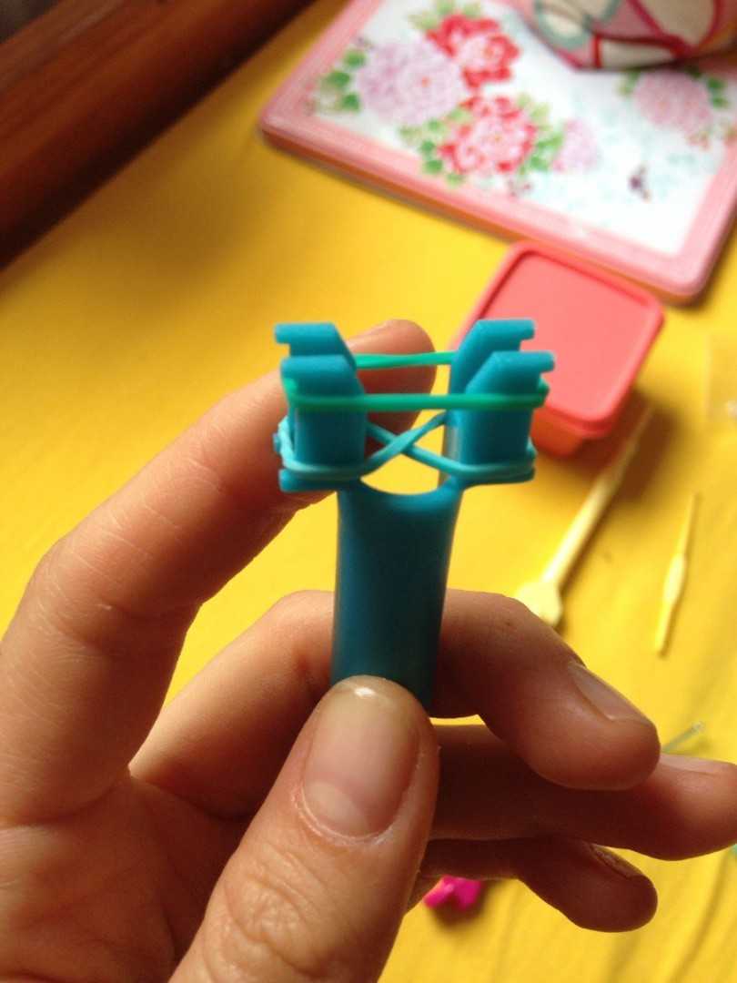 - Скрепляем резинкой две вилки. Одну петлю надеваем на первый изнутри зуб правой вилки, а вторую — на последний левой вилки. Таким образом, как бы оказались соединены две вилки.