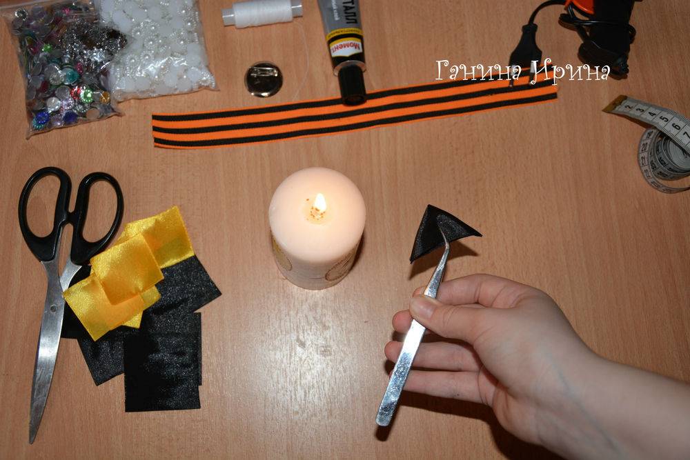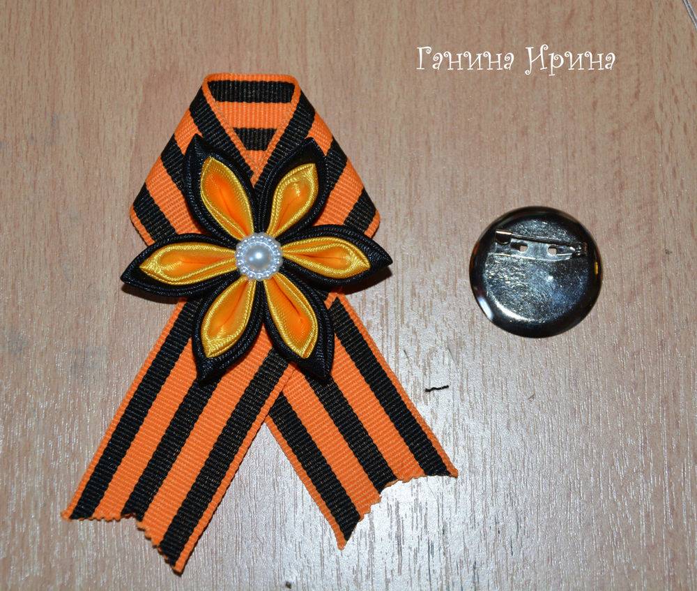 День Победы – один из почитаемых праздников у нас в стране. В память о погибших воинах мы с гордостью надеваем георгиевскую ленточку на грудь. Георгиевская ленточка – символ этого великого праздника Дня Победы, который отмечают у нас в стране ежегодно 9 Мая. В последнее время георгиевскую ленточку преобразуют в красивые броши. Броши из георгиевской ленты, выполненные в технике канзаши являются не только символом, но и украшением. Сделать брошь своими руками на 9 Мая не сложно, Вашему вниманию предлагаем мастер – класс для начинающих по изготовлению броши на 9 Мая в технике канзаши. •