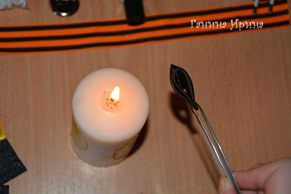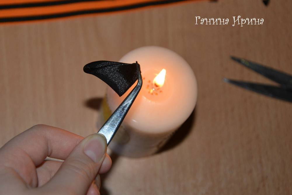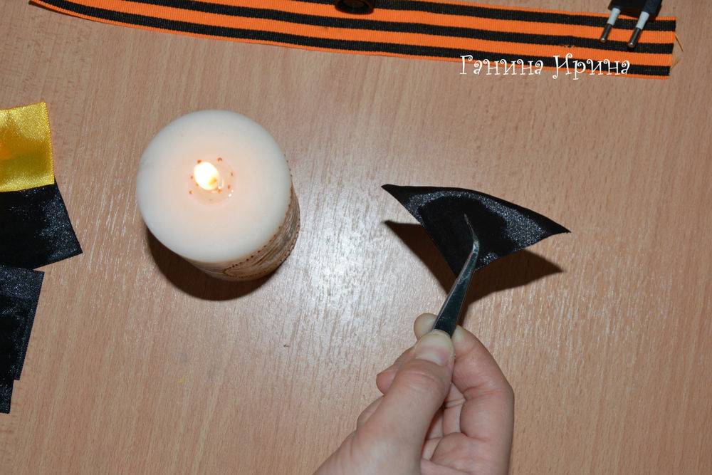 7. Откладываем веточку из лент в сторонку и приступаем к созданию основы броши из георгиевской ленточки. Нам понадобиться отрезок ленты длиной 28 см. При помощи зажигалки обрабатываем концы ленты, чтобы не крошились.