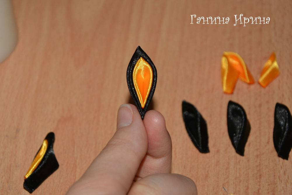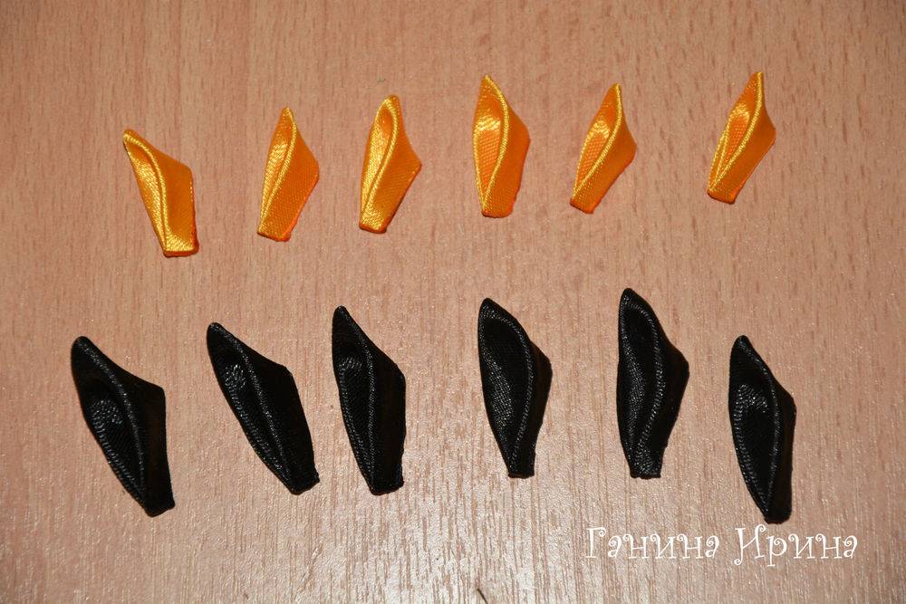 - Заготовки из оранжевых ленточек соединяем с черными, вкладывая оранжевую изнутри: