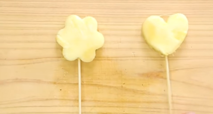 - Каждую половинку срезанных фруктов нужно обернуть пищевой пленкой, а затем наколоть на шпажки (одну, две или больше). Концы пленки скотчем приклеиваем к шпажкам, чтобы не было складок на поверхности.