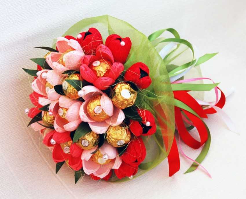Вы собрались изготовить такой букет в подарок? Делайте его как можно ближе к празднику, чтобы букет выглядел свежим. Лучше прямо в день торжества. Букет на фото получился классической формы, его необходимо поставить в вазу. Смотрите, какой он аппетитный.