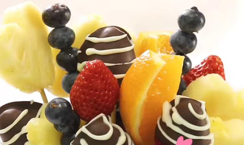 - Допустимо использовать шоколадную глазурь на желатиновой основе. Часть фруктов можно покрыть глазурью полностью, где-то нанести полосками. Ягоды лучше окунуть в глазурь и дать застыть.