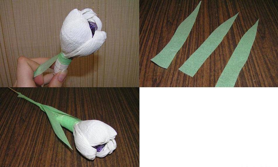 Из зеленой бумаги рекомендуется вырезать по два прямоугольника, из них изготавливаются листья тюльпана. Длинной полоской обматывается стебель, к нему крепятся два листочка друг напротив друга.