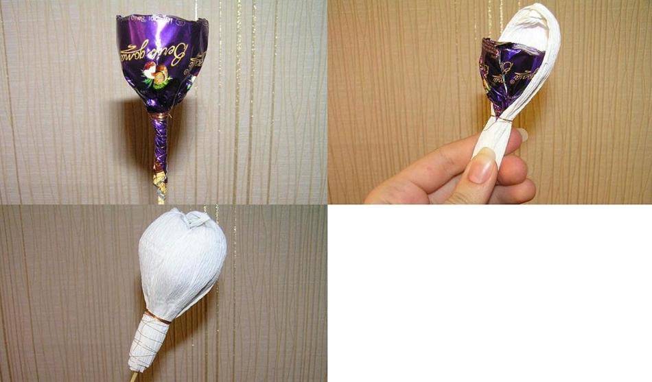 - сделать лепестки с широким основанием, обернуть ими конфету, формируя пышный бутон, все закрепить снова ниткой
